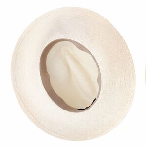The structured Panama silhouette and neutral ivory tone make it a versatile accessory that pairs beautifully with both casual and upscale looks.