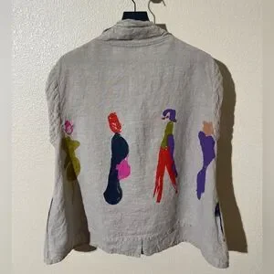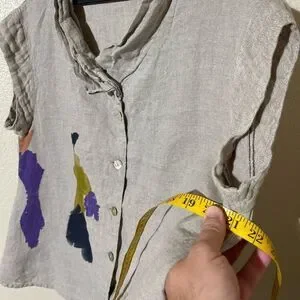 Elevate your wardrobe with this elegant beige linen blouse. Featuring a unique artistic design, it's perfect for adding a touch of sophistication to any outfit.