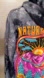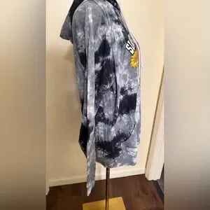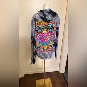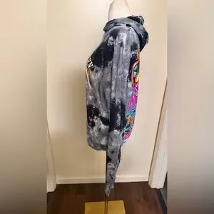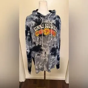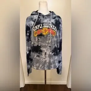 Simply Southern pullover hoodie in black and gray tie-dye. Bright floral graphic at chest with yellow and orange blooms. Drawstring hood and kangaroo pocket. Casual, cozy style.