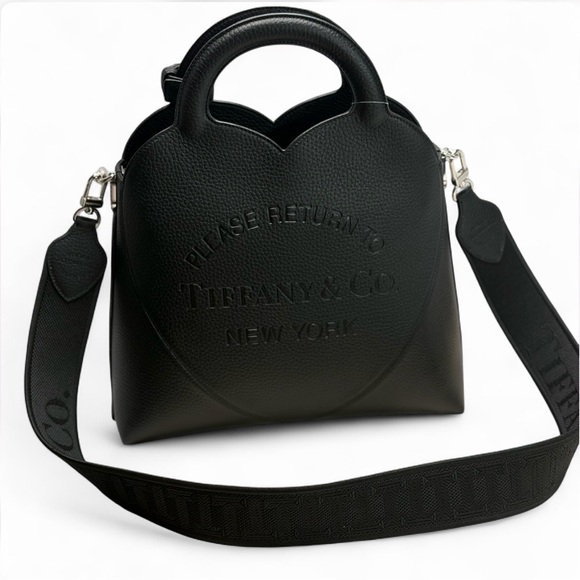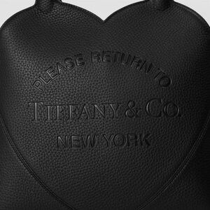 Return to Tiffany Heart Bag made of black leather, featuring a prominent heart-shaped outline and the iconic "Please Return to Tiffany & Co. New York" inscription embossed on the front.