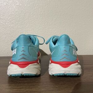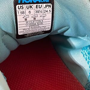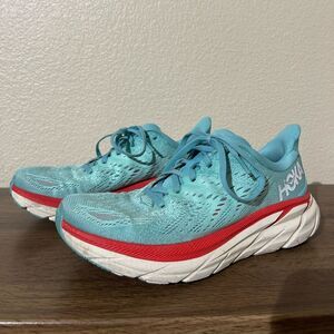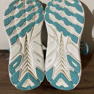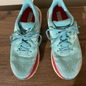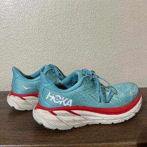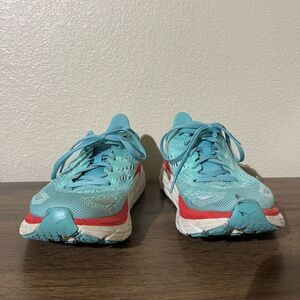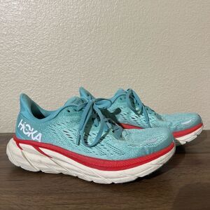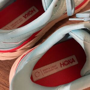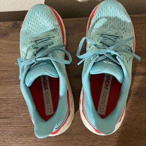 Hoka shoes in teal with red detailing. Perfect for running and active wear.
