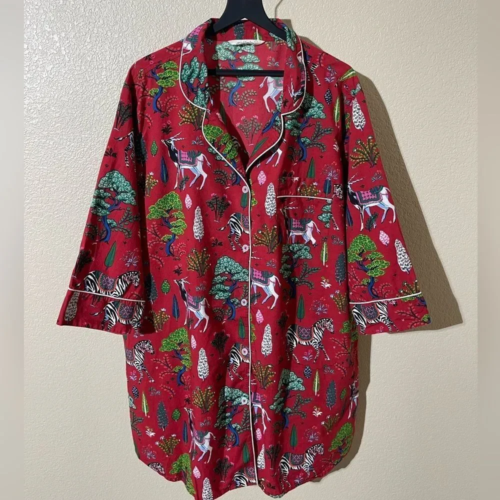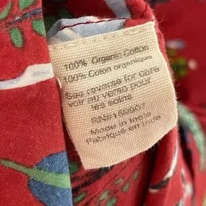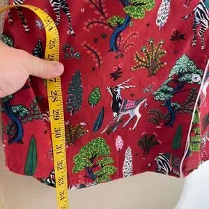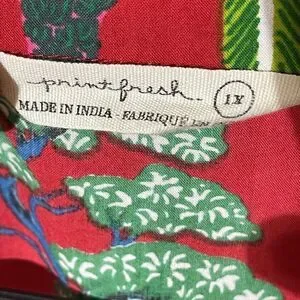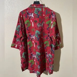 Bold red top with green and blue tree design. Features intricate white details.