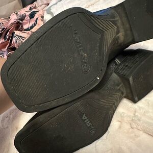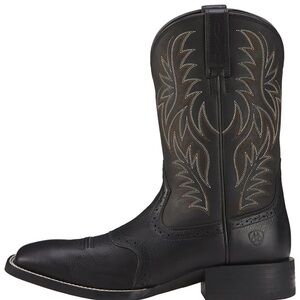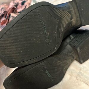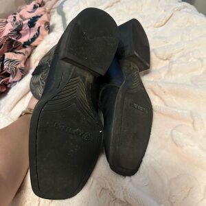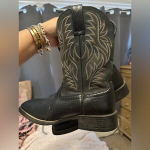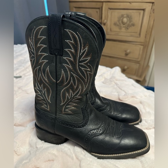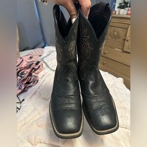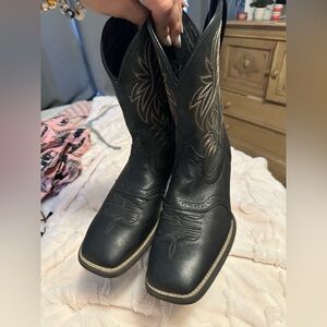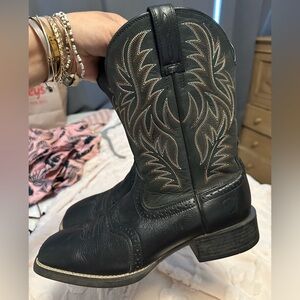 Stylish black cowboy boots with intricate stitching. Perfect for a western look. Vguc retails $190