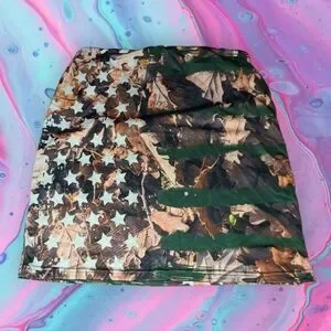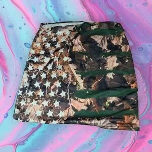 Juniors size small camouflage flag mini skirt. Pre owned but still in pretty good condition overall. May have one or two minor imperfections. Cross posted to sell faster. Always willing to bundle items for one shipping price. Message me before buying if you need help to make a bundle. If not purchase or bundle as you please.