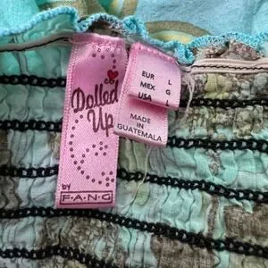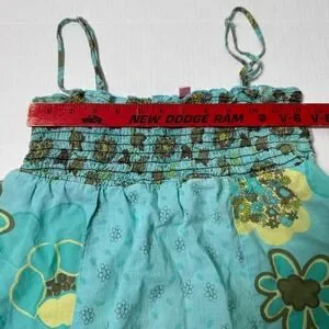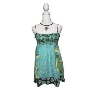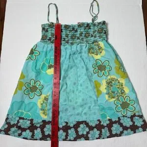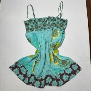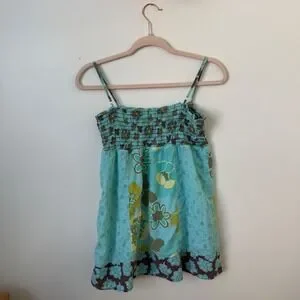 Dolled Up by Fang floral babydoll tank top. Features a stretchy smocked bodice with thin adjustable straps and a flowy babydoll silhouette. Mixed retro floral prints in blue give it a fun Y2K / boho vibe.