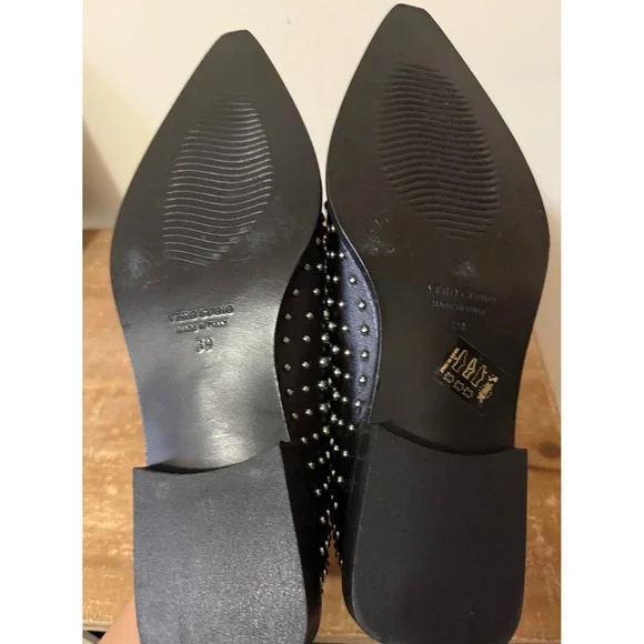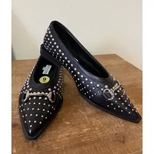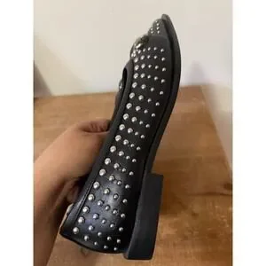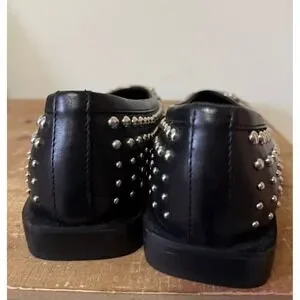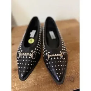 NWOT. Steve Madden pointed-toe loafers in black leather showcase an edgy aesthetic with all-over silver-tone stud embellishments and a classic horsebit detail. Crafted in Italy with a Vero Cuoio leather sole.