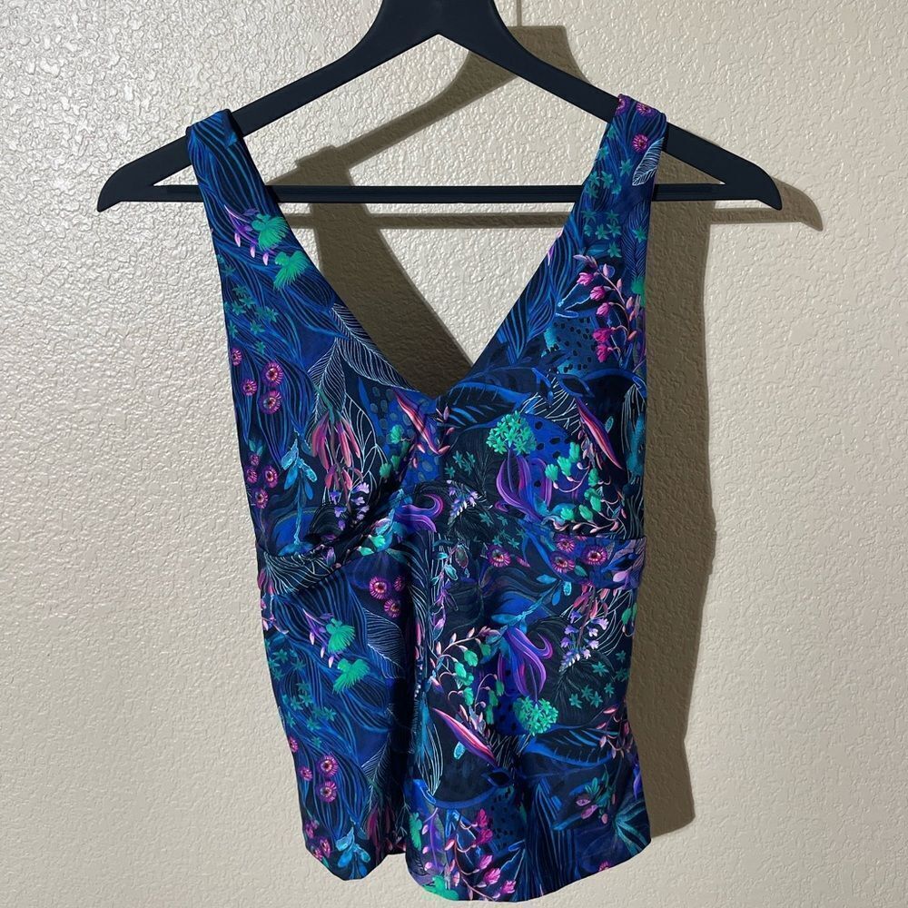 Stylish swim crop top with vibrant floral design. Features a V-neck and bold colors. Perfect for beach or pool days.