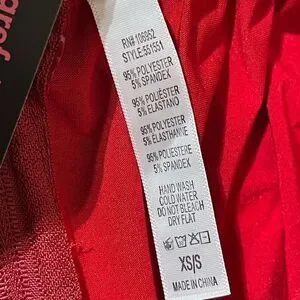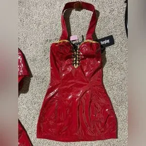 Glossy red costume with hooded cape and dress. Includes matching leg covers. Perfect for dress-up fun.