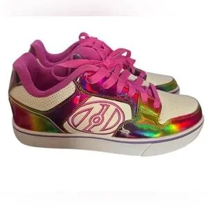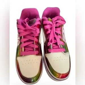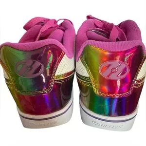 Fun and flashy Heelys Motion Plus roller sneakers in a white and rainbow glitter metallic colorway with bright pink laces and lining. These iconic skate shoes feature the signature removable wheel in the heel, letting you walk or roll depending on the setup.