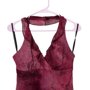 Vintage Rampage halter dress with a dark romantic, slightly gothic vibe. This piece features a flattering halter neckline and subtle sparkle throughout the fabric that catches the light beautifully. The silhouette is feminine and slightly sultry with a soft drape that gives it that classic early 2000s going-out look.