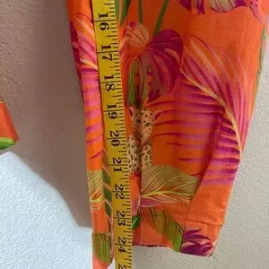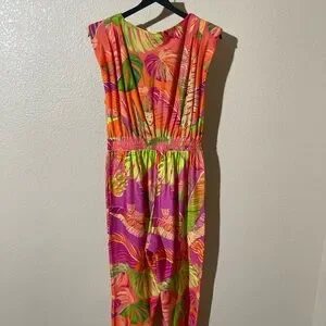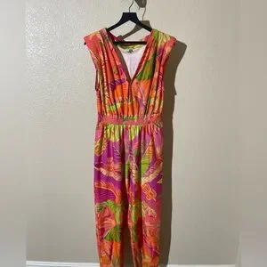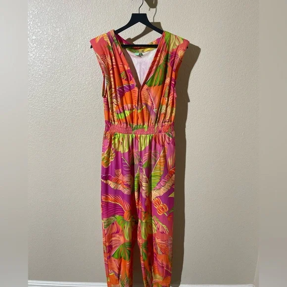 Vibrant jumpsuit with tropical leaf pattern. Features pink, orange, and green hues. Sleeveless design with a flattering fit.