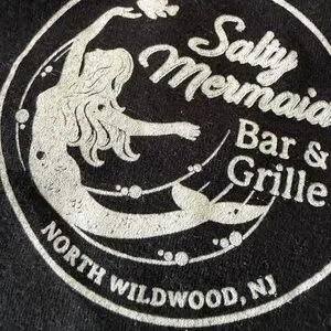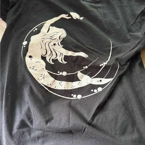 Soft black tee featuring a large silver mermaid print. Casual and artistic chest design. Easy to pair with jeans or leggings.