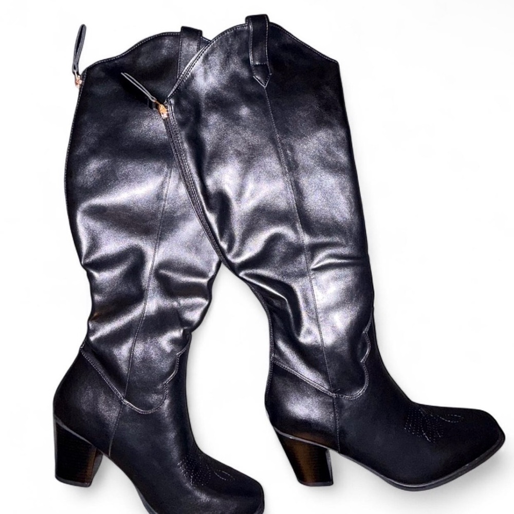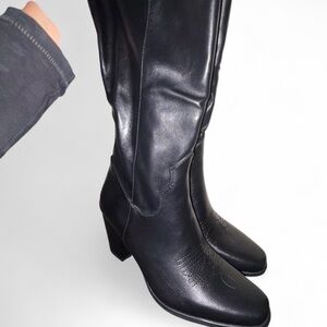 Classic black mid-calf leather boots with a stacked heel. Smooth leather upper with side zip for easy on and off. Versatile style for everyday and dress looks. Comfortable heel height and cushioned insole for all-day wear.