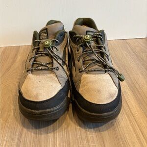 Low-profile trail sneakers with suede upper and rugged rubber sole. Secure lace toggle for quick fit. Padded collar and supportive midsole for comfort on the move. Neutral tones match outdoor apparel.