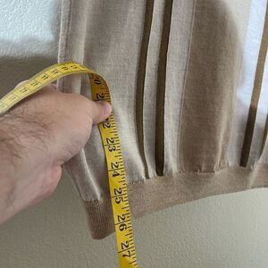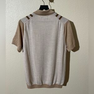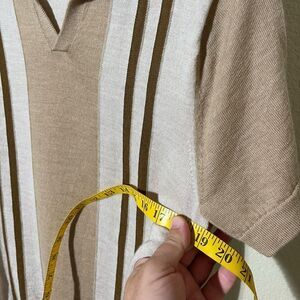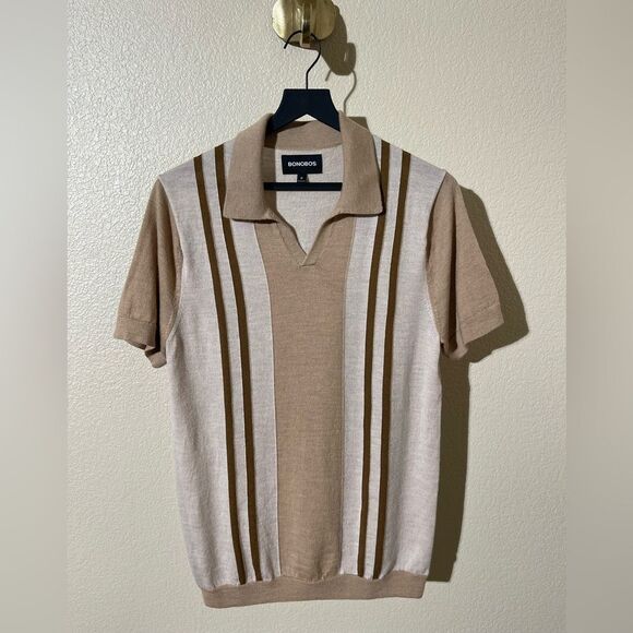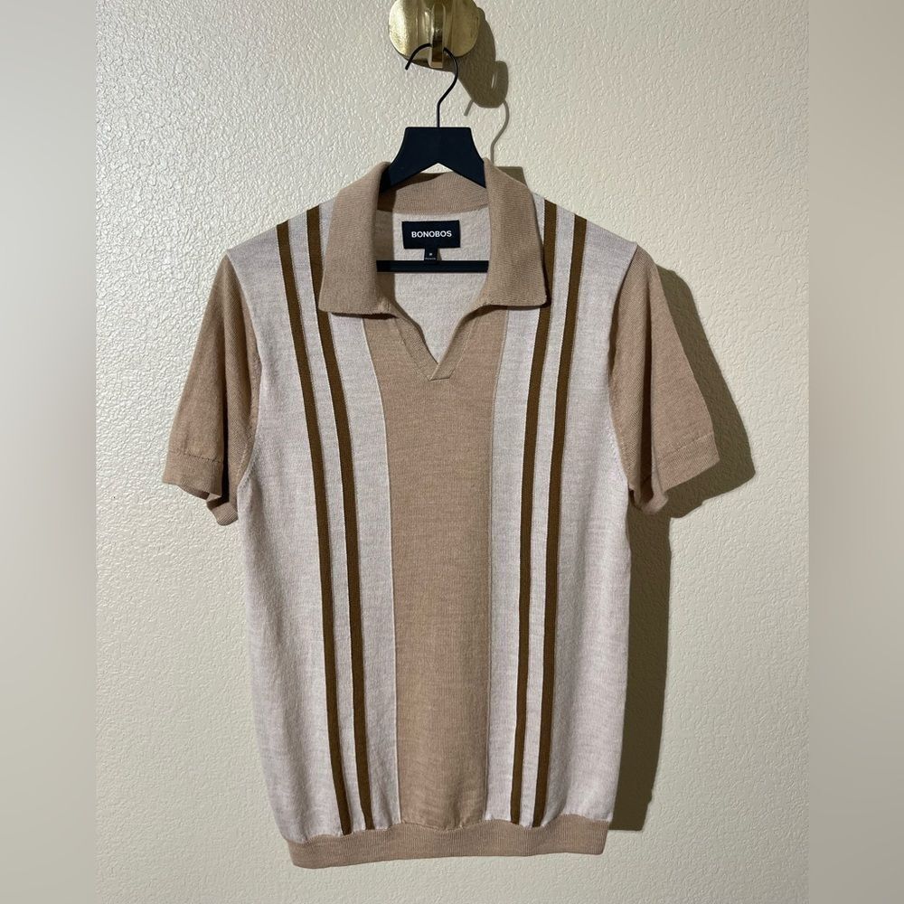 Stylish polo with tan and brown stripes. Comfortable and versatile for any occasion.