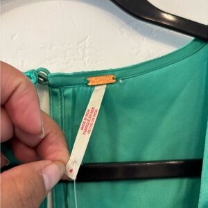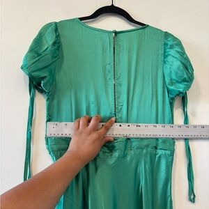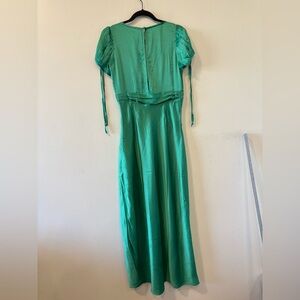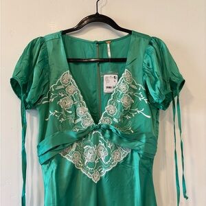 Free People maxi with embroidered V-neck detail. Empire waist with tied sash. Short sleeves with adjustable ties. Flowy skirt for easy movement. Feminine lace-style embroidery accent.