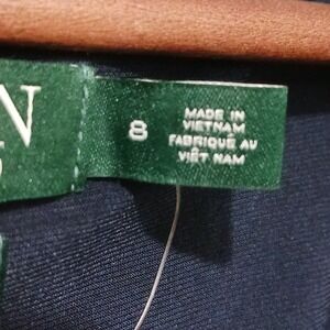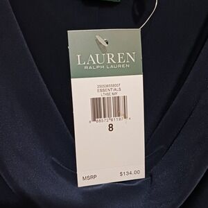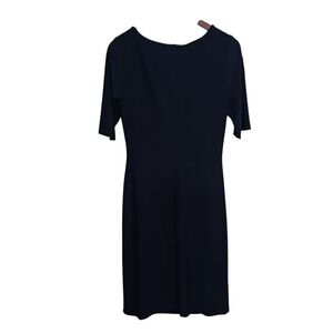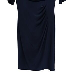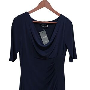 Lauren Ralph Lauren Essentials sheath dress in a deep lighthouse navy blue. This elegant piece features a sophisticated cowl neckline and flattering side ruching that creates a draped silhouette. Designed with elbow-length sleeves and a comfortable stretch jersey fabric, it offers a polished look suitable for professional settings or evening events. The dress is finished with a clean back and a classic knee-length hem.