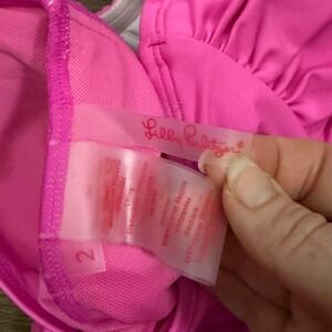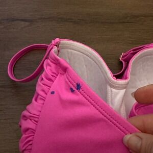 Keywords: one piece, swimsuit, halter neck, ruched, bright pink, beachwear, resort wear, summer fashion, poolside, vacation, tropical, athletic, flattering fit