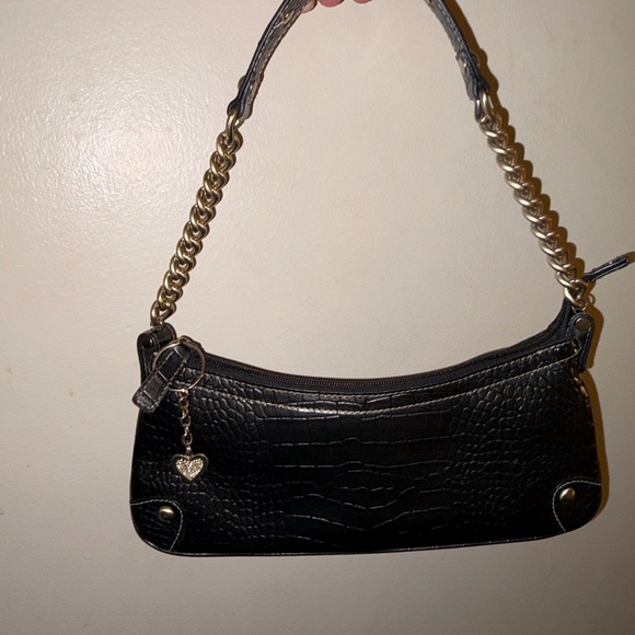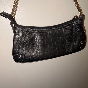 Stylish black croc-embossed shoulder bag with a gold-tone chain handle. Sleek silhouette and subtle hardware details for a polished look. Versatile for day-to-night wear and pairs easily with any outfit.
