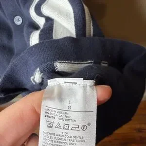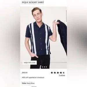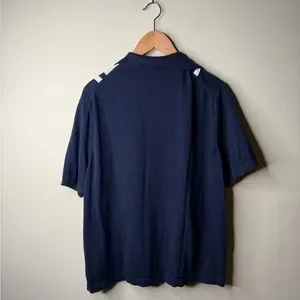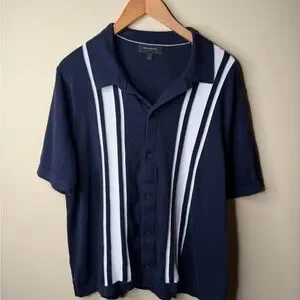 Design Details: Vertical Stripes, Racing Stripes, Contrast Panel, Camp Collar, Textured Knit, Navy & White.