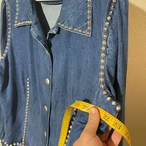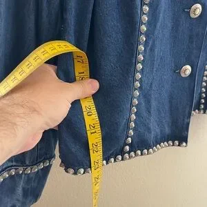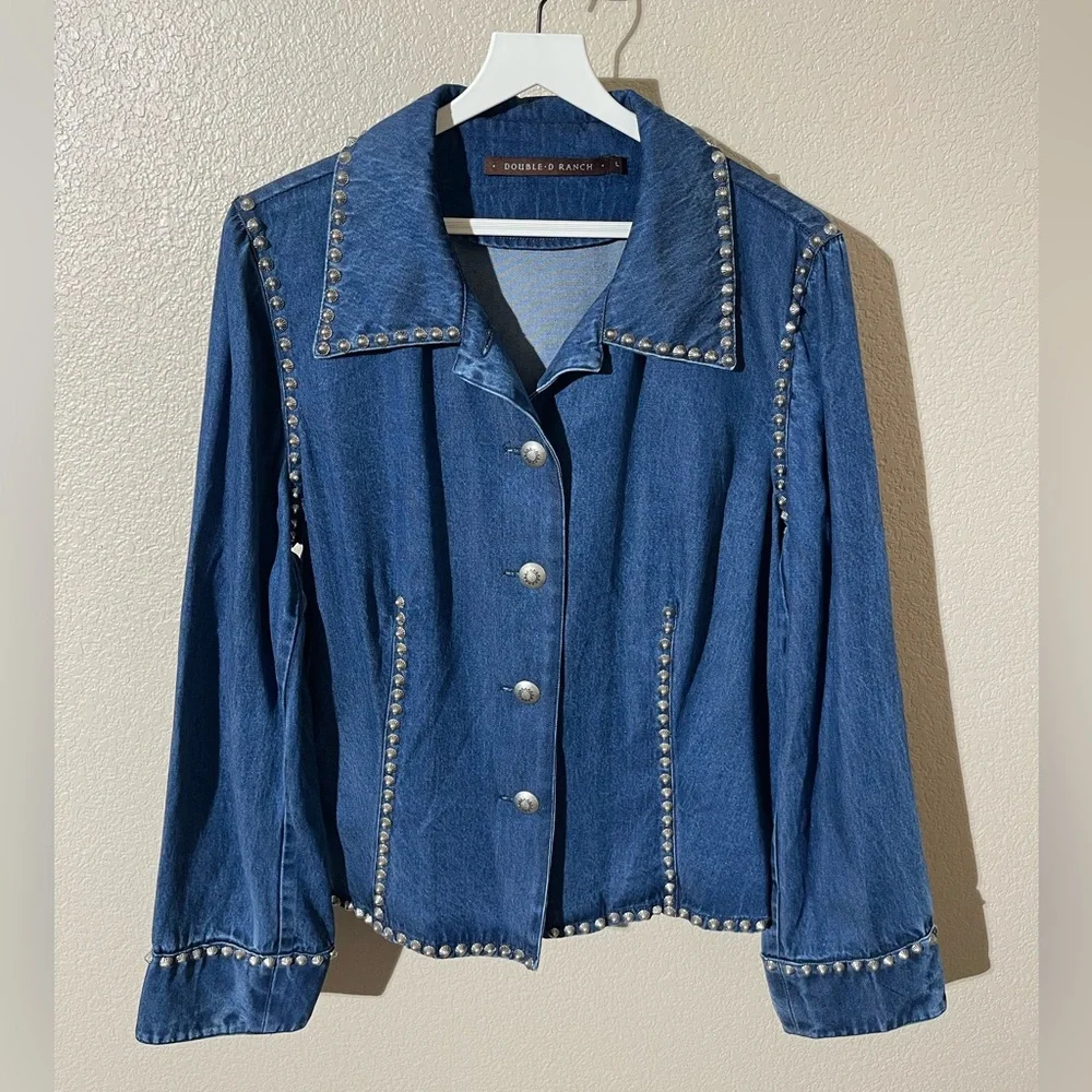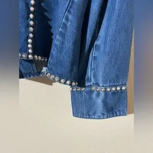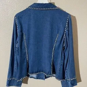 Chic blue denim jacket with striking silver studs. Ideal for a stylish look.
