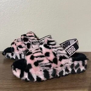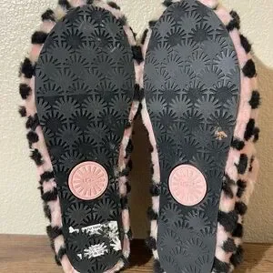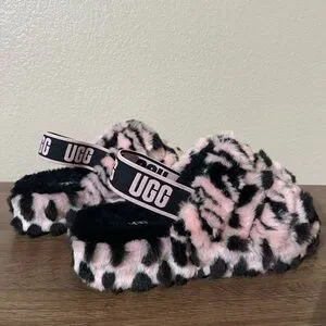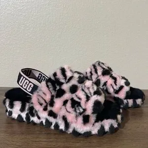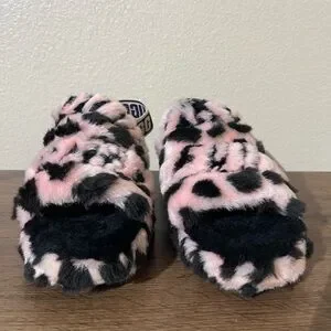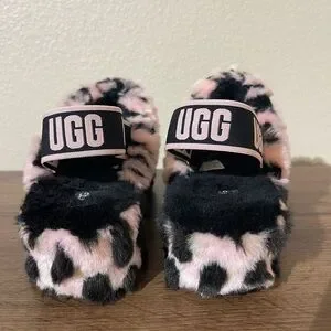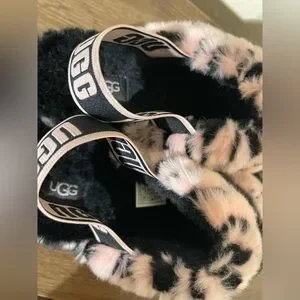 Stylish fuzzy slippers with leopard pattern. Features UGG logo strap.