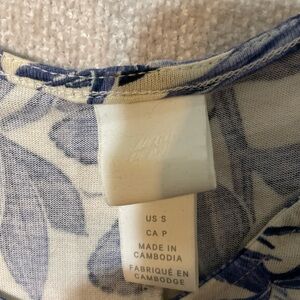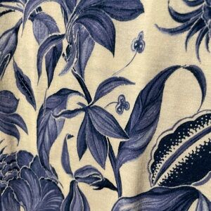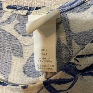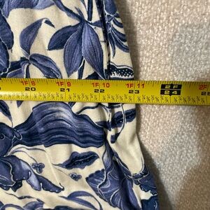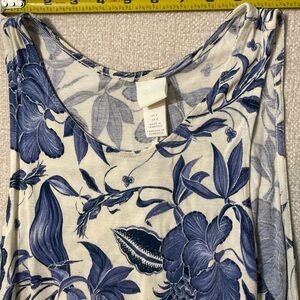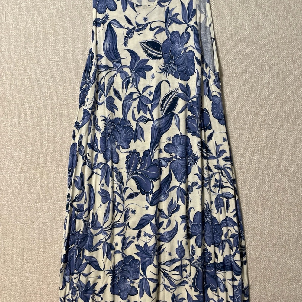 Total length 35 inches. Elegant midi dress with blue floral pattern. Sleeveless design. Perfect for casual outings.