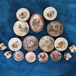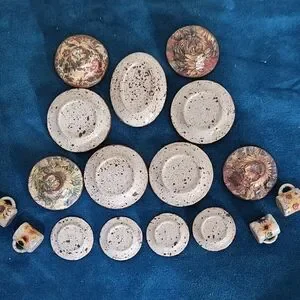 The dinnerware mimics stoneware with a darling selection of roosters, sunflowers, bees, butterflies, and a lady bug. Dishes are originally plastic, so they won't break if the grands play with them.
