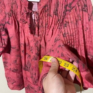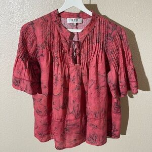 Chic red blouse with floral pattern. Features pleated details and short sleeves.