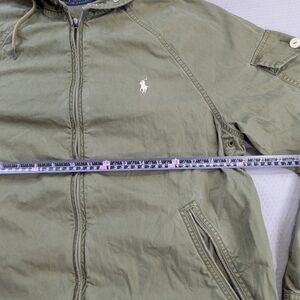 Classic khaki jacket with hood. Features front zip and buttoned cuffs. Iconic logo on chest.