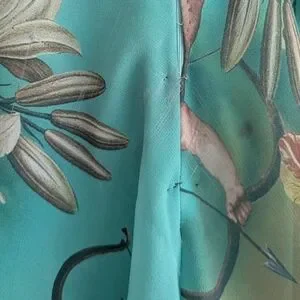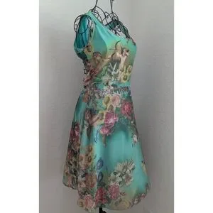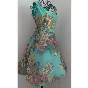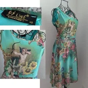 *** Sold *** UNBELIEVABLE Cupid cherub and floral A -Line style dress. Stunning colors. This dress appears to come from now closed clothing store, B&S Line in the Osmanbey neighborhood of Turkey - making this a truly unique and one of a kind find. Shown from several angles, in natural light, with the fan blowing the skirt in some angles (it does not have a full skirt, but I'm sure you could add a petticoat if you like the fullness). Gives John Paul Gaultier or Save the Queen vibes. Tagged size 42, measurements shown. Given that it is Euro sizing, please ensure that the measurements for you prior to ordering. Overall good shape with some minor flaws shown. Note, dress is designed to have a distressed look.