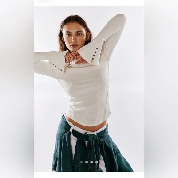 Free People Soul Sister top, We The Free layering top, ribbed flare sleeve top, off shoulder boho top, cream long sleeve top, FP thermal top, cottagecore outfit, festival top, soft girl aesthetic