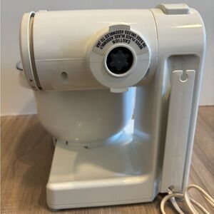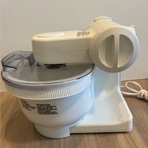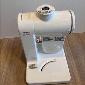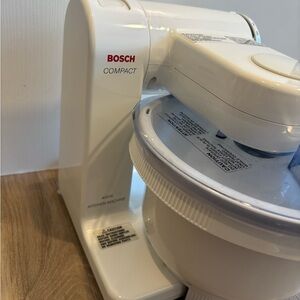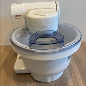 Bosch Compact stand mixer in white with a clear lid. Includes mixing bowl and three durable attachments for whisking, beating, and dough mixing. Easy to operate and designed for everyday kitchen tasks. Clean white finish enhances any countertop.