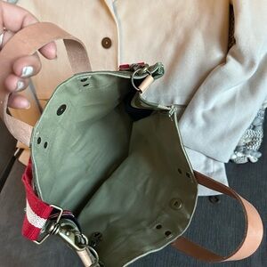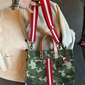 Stylish camouflage tote bag featuring bold red straps. Perfect for everyday use with a touch of adventure. Not anthro bought from boutique this is the cutest!