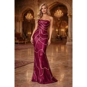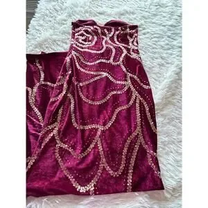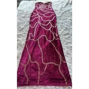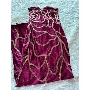 Absolutely stunning burgundy velvet maxi dress with intricate gold sequin detailing ✨ — this piece is giving full glam, red carpet energy.