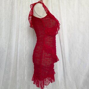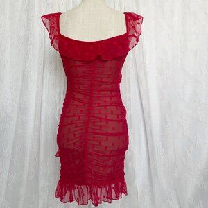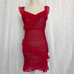 Majorelle Women's Bandit Mini Dress Red Polka Dot Off Shoulder Mesh Ruffle Stretch Valentine's Date Romantic Sexy Flirty Coquette Event Birthday Vegas