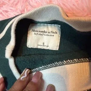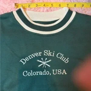Abercrombie & Fitch crewneck sweater in deep forest green. Contrast cream stripes at collar and sleeves. Embroidered 'Denver Ski Club Colorado, USA' logo at chest. Soft, casual style ideal for layering