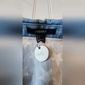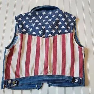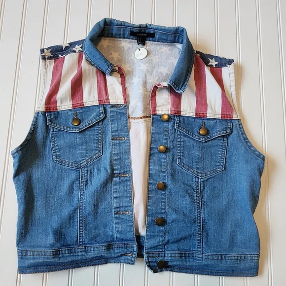 Sleeveless denim vest by Forever 21. Features patriotic red and white striped yoke with star print. Front button closure and flap chest pockets. Classic blue denim throughout. Casual, versatile layering piece.