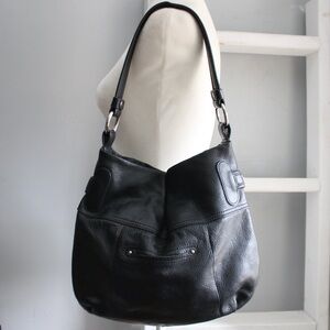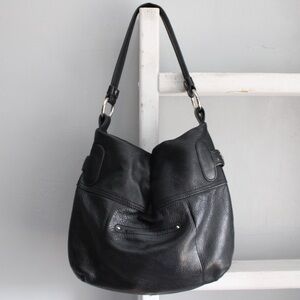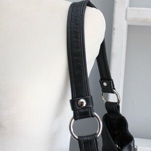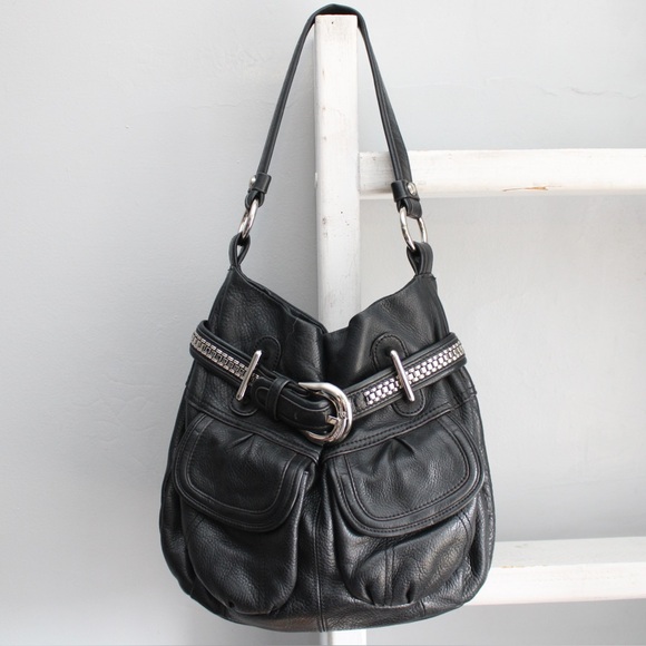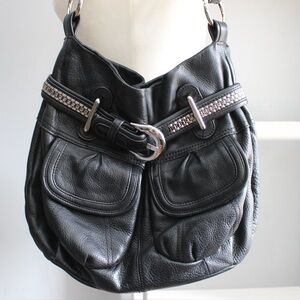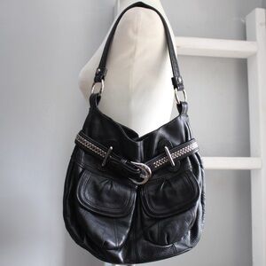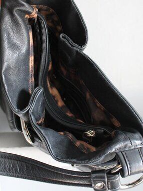 Black leather shoulder bag with double pockets and silver buckle detail on the front.