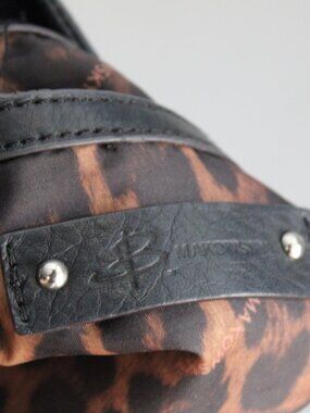 Leopard print lining. Multiple compartments on the inside.