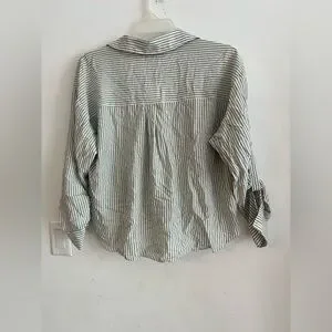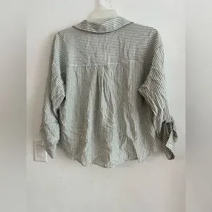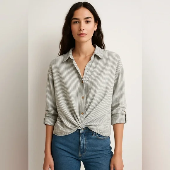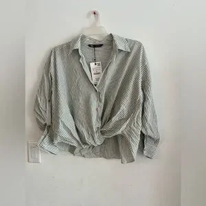 Zara striped blouse. Featuring a relaxed fit with a flattering front twist detail, this lightweight top blends comfort with effortless sophistication. The soft gray and white pinstripes give it a timeless look, perfect for both casual and polished outfits.
