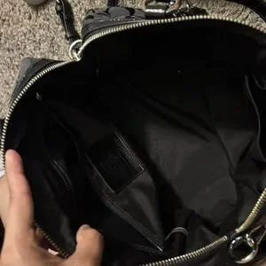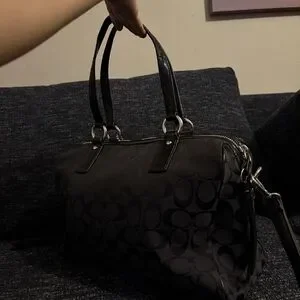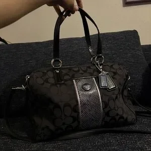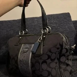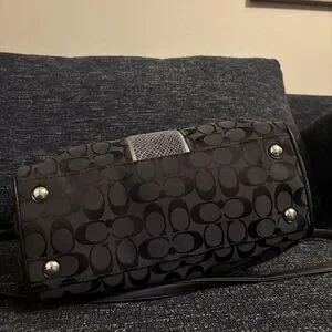 Coach women's satchel in black signature jacquard. Textured center stripe for contrast. Dual top handles and polished hardware. Compact, structured silhouette with Coach tag detail.