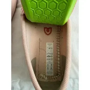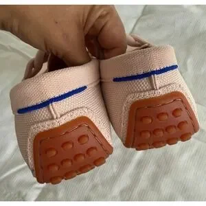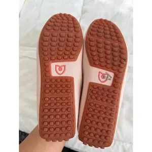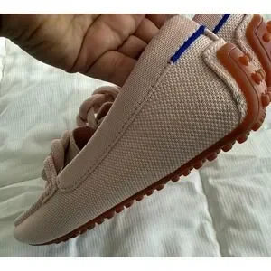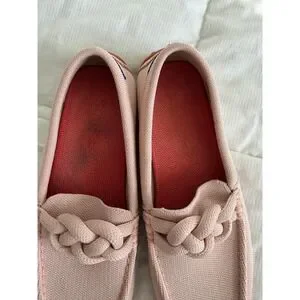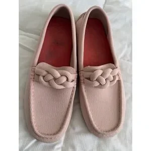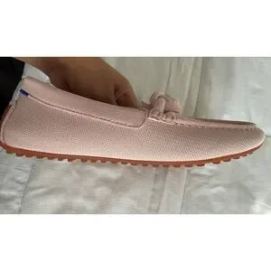 Excellent used condition. Rothys The Driver loafers in a soft petal pink feature a unique braided knot detail across the vamp for a sophisticated touch. These sustainable slip-on shoes are crafted from the brand's signature recycled knit material, offering a flexible and breathable fit. Has some scuffs see photos and one of the soles has some damage. These can be washed.