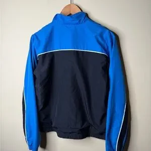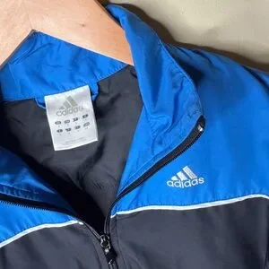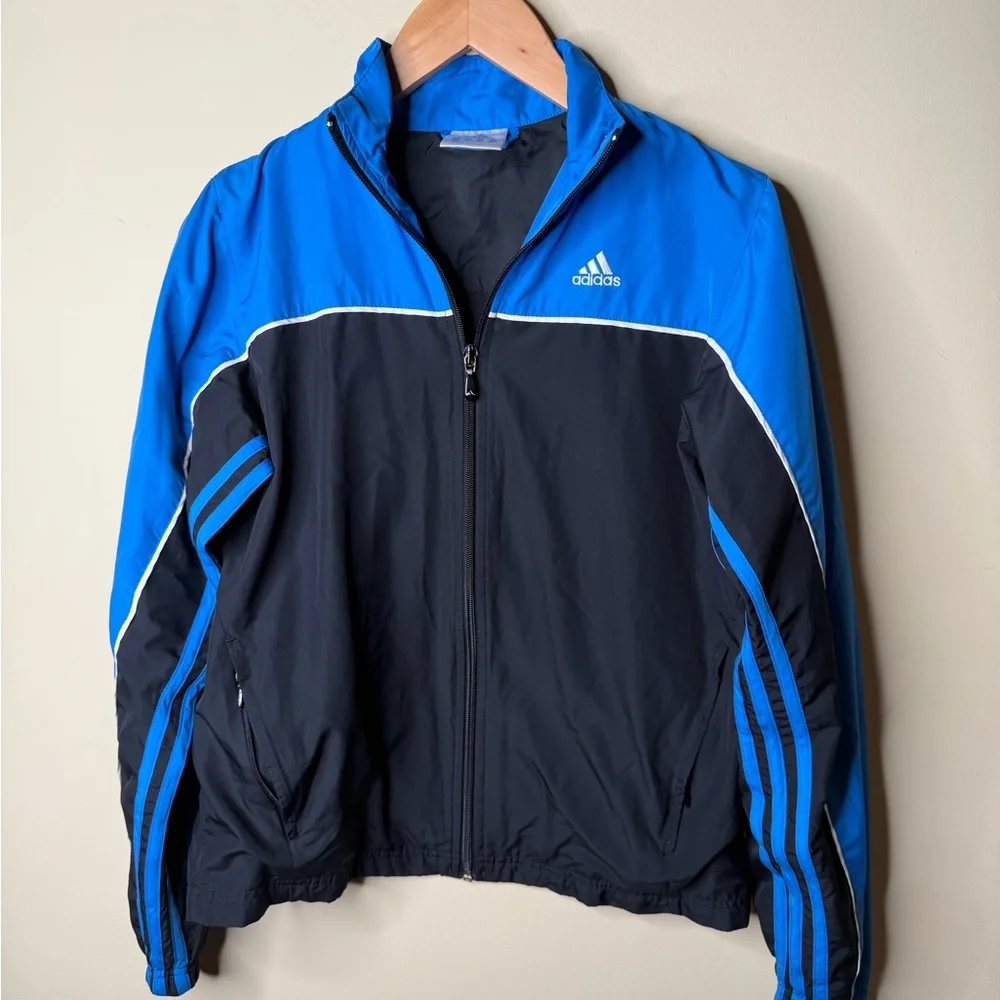 Lightweight athletic zip-up jacket. Blue panels with black body and blue stripe detailing. Features Adidas logo on chest. Full front zipper and zip pockets. Sporty everyday style.