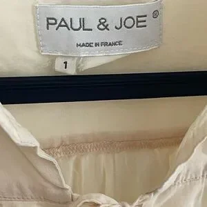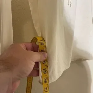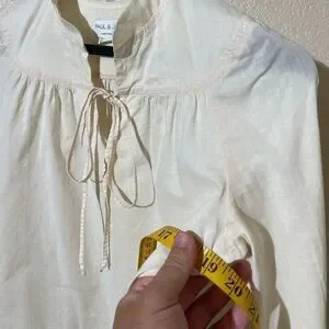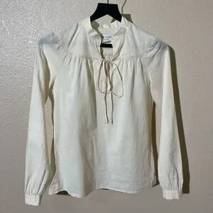 Chic ivory blouse with tie-front. Long sleeves and gathered neckline. Versatile and stylish.