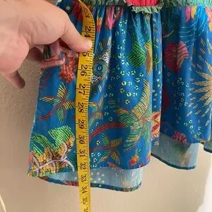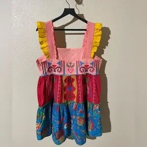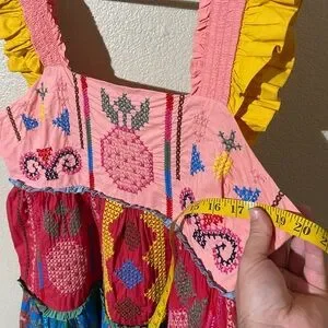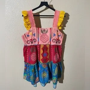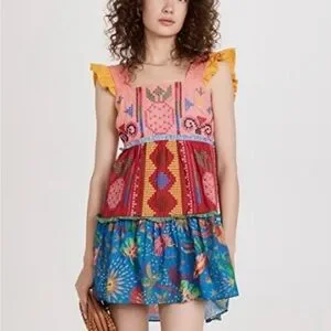 Colorful embroidered mini dress with ruffle straps. Square neckline and tiered skirt. Vibrant mixed-print panels. Playful, boho aesthetic.