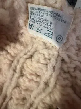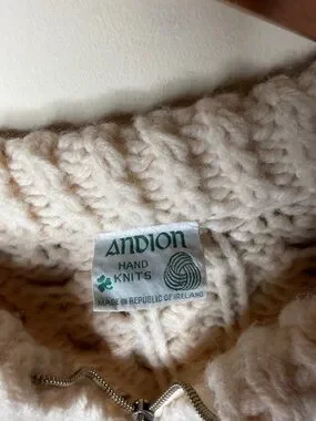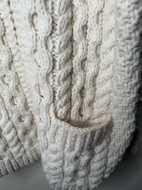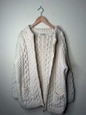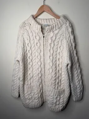 Cozy cream cable knit sweater cardigan with a full zip front. Soft, textured knit offers warmth and comfortable layering. Front pockets add practical style. Timeless design ideal for everyday wear.