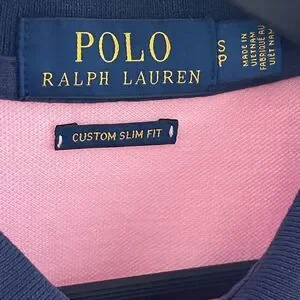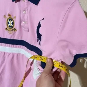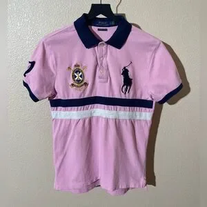 Charming pink polo with navy accents. Features classic Ralph Lauren logo. Perfect for casual outings.