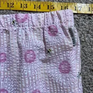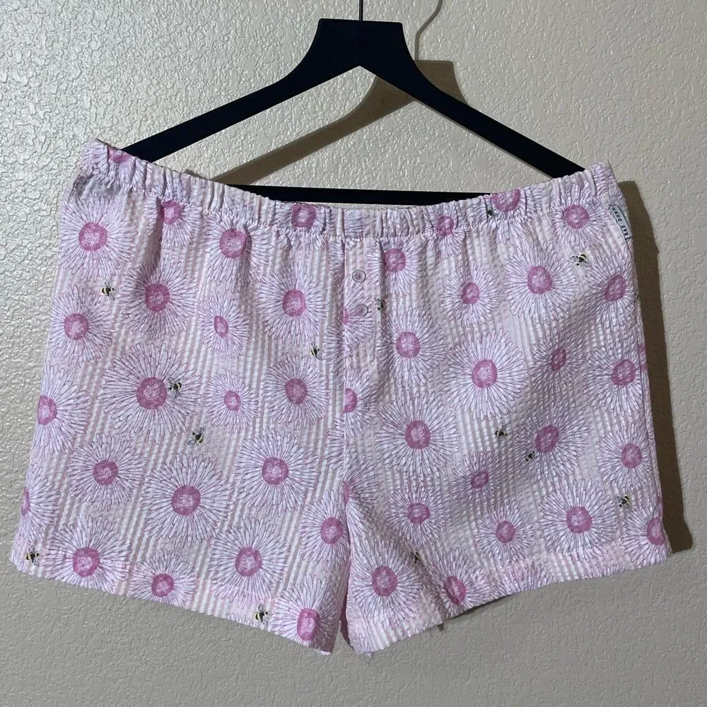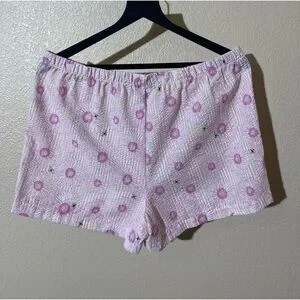 Comfortable pink pajama shorts with floral pattern. Elastic waistband for easy fit. Perfect for lounging.