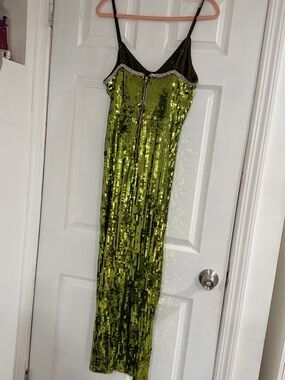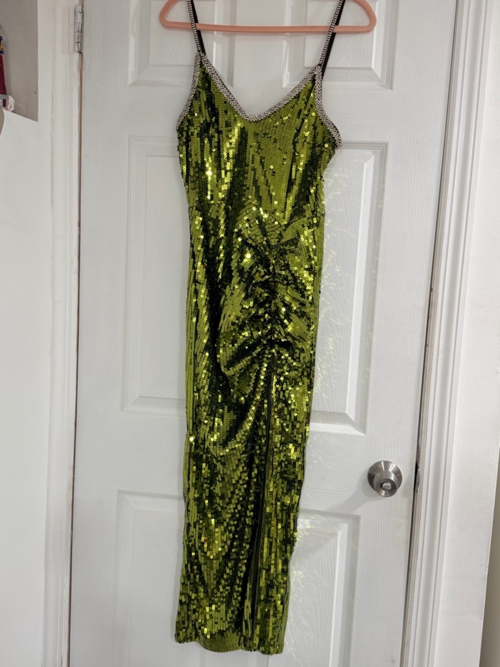 Glittering lime green sequin cami with sparkling rhinestone trim. Slim straps and scoop neckline. Bold, party-ready shine.